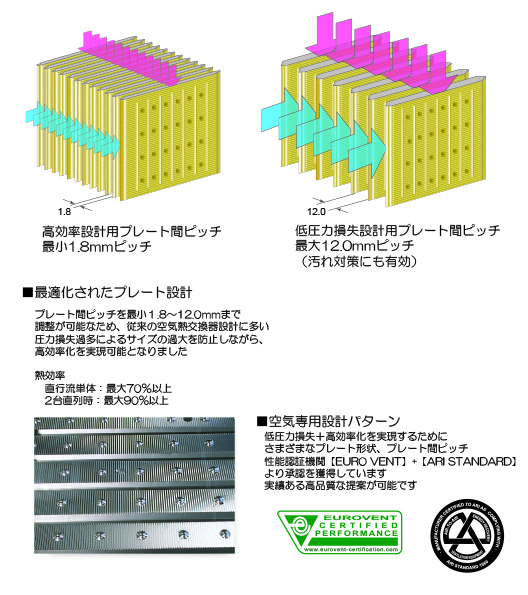 アルミ又はステンレス製プレート式熱交換器、空気/空気用専用に最適化したプレート形状採用圧力損失過多によるに サイズが必要以上にサイズアップ、コストアップしてしまう問題を、形状、ピッチで改善。固定式、カセット式など多様に応用 が可能なためヒートポンプ用熱源としても適用可能。国内熱設計と営業ライセンサーであるMDIにより即座に回答可能とな りました。最大100,000m3/h+200℃にも対応可能。ドイツ衛生規格ILH BERLIN[RLT-Hygiene]認証済病院/施設用 衛生用換気熱回収熱交換器に利用可能。